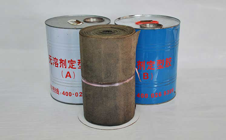 5、涂膠和鋪纏帶:把配比攪拌好的定型膠用干凈毛刷或滾刷均勻足量涂敷一遍,確保無(wú)漏涂后即可鋪纏基帶,按20~25mm寬度搭接,延長(cháng)搭接100~150mm,疊層/搭接處涂刷定型膠,附平拉緊,不得出現鼓包。
