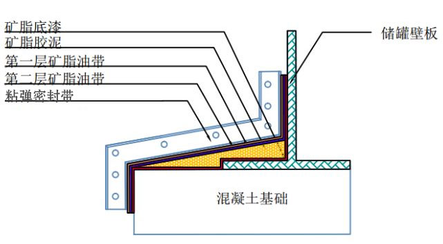 大型儲罐邊緣板部位長(cháng)期受到暴曬、淋雨的現實(shí)情況,所用的防腐材料必須具備防水和防紫外線(xiàn)特性。同時(shí),考慮儲罐隨載荷和溫度的變化會(huì )產(chǎn)生形變的情況,所用的材料必須具有彈性和韌性且具有很好的可塑性。為了防止日常檢修和冬季墜冰對防腐層造成磕碰損壞,防腐材料還必須具備抗機械沖擊特性。針對儲罐邊緣板受到環(huán)境影響和破壞,防腐方案可以采用儲罐邊緣板防腐冷纏帶和礦脂防腐帶的組合使用,具體防腐方案如圖所示。
